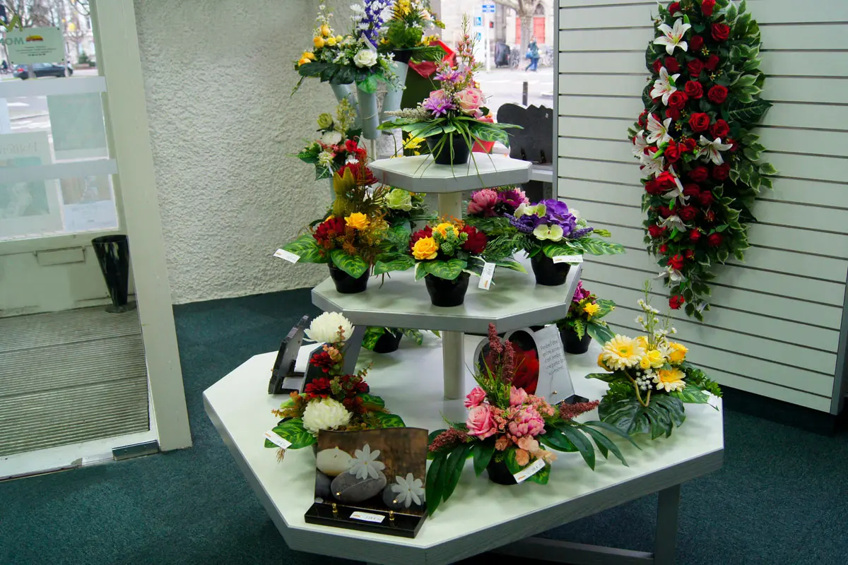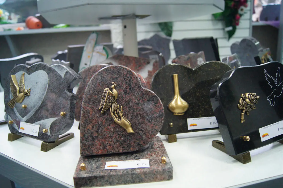 Nous vous proposons un large choix de fleurs artificielles et de plaques funéraires en granit ou personnalisées.